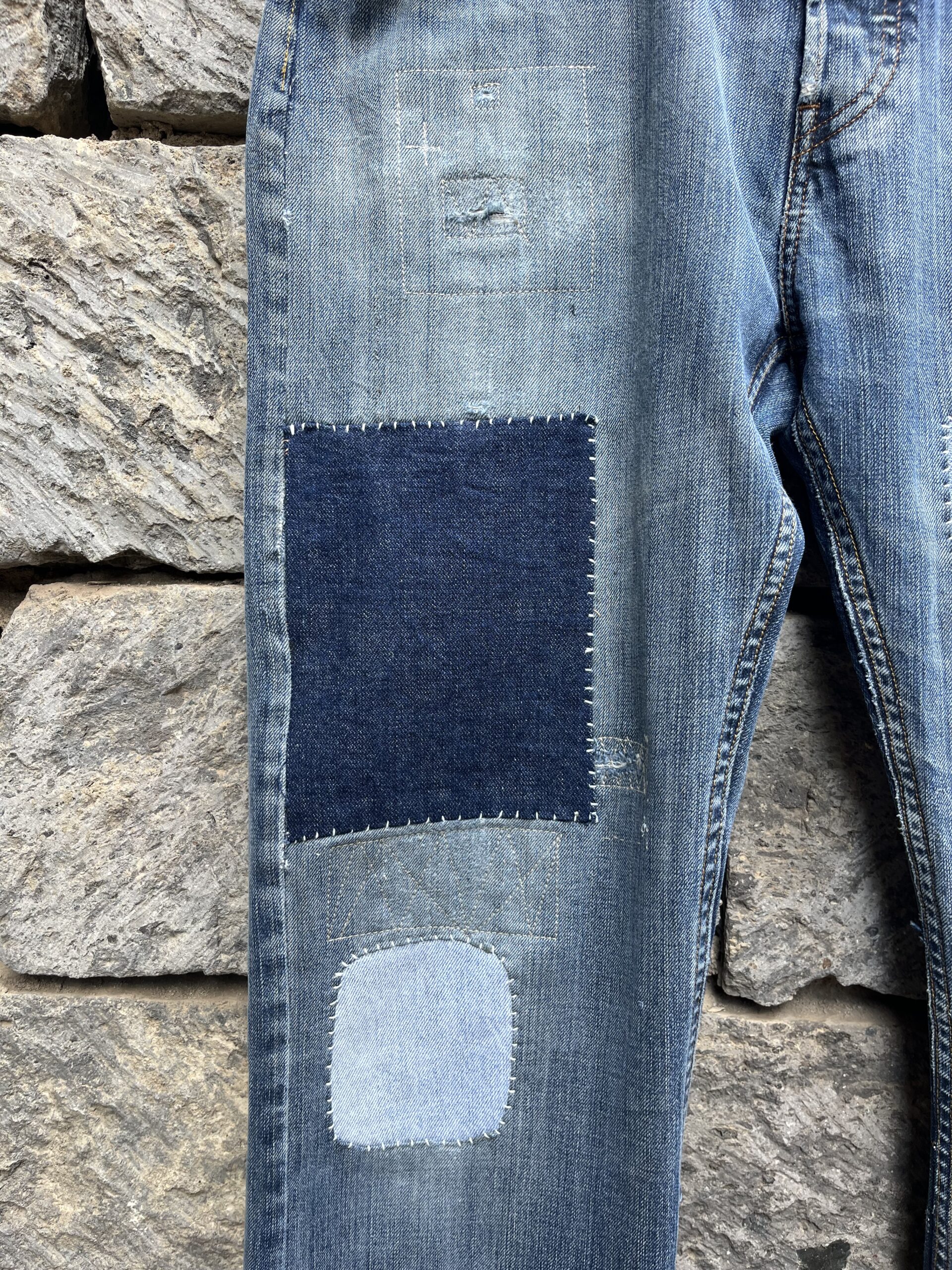 One of a kind limited edition,customized denim pant reinforced through hand applied patchwork ~adding subtle contrast without overpowering the original denim.