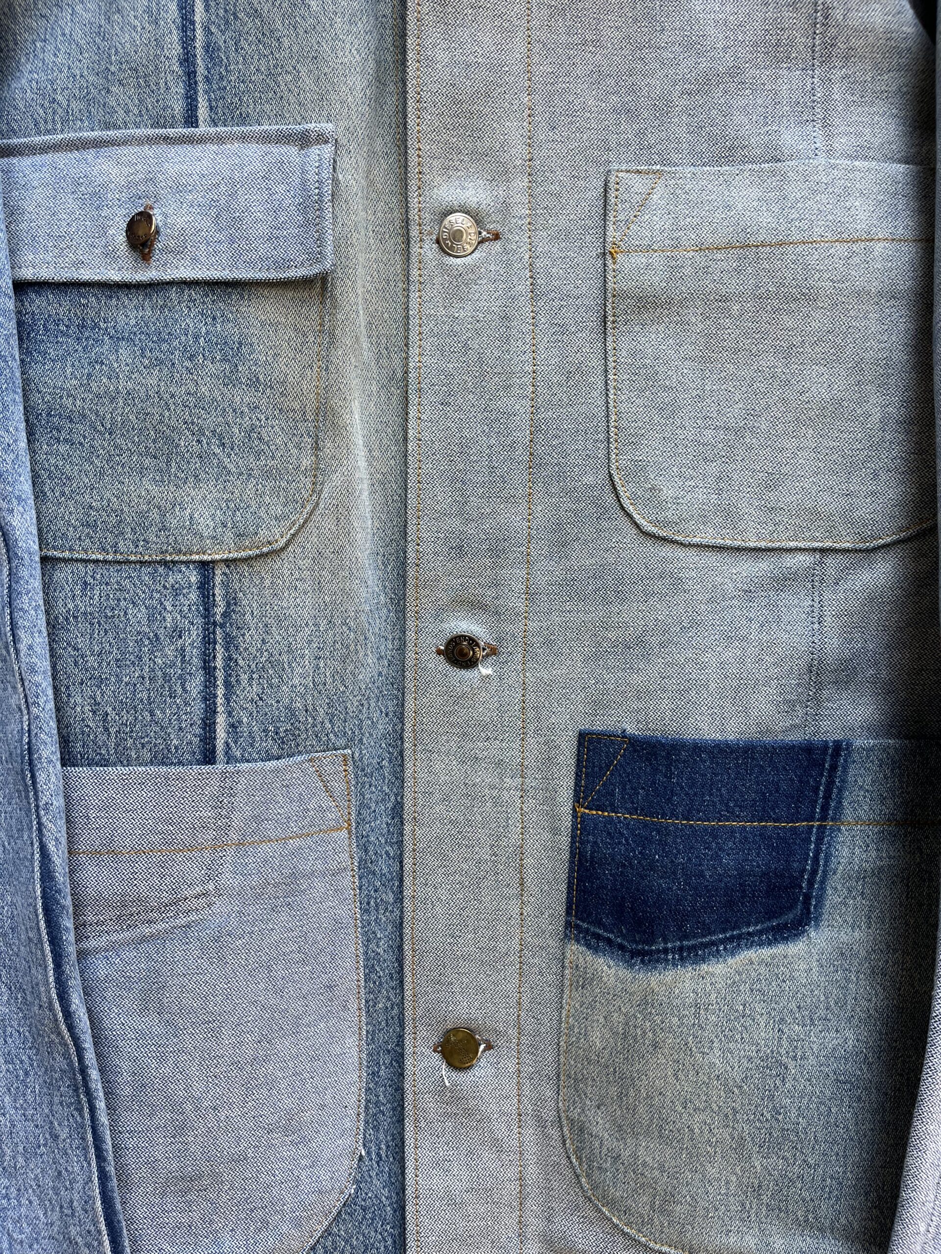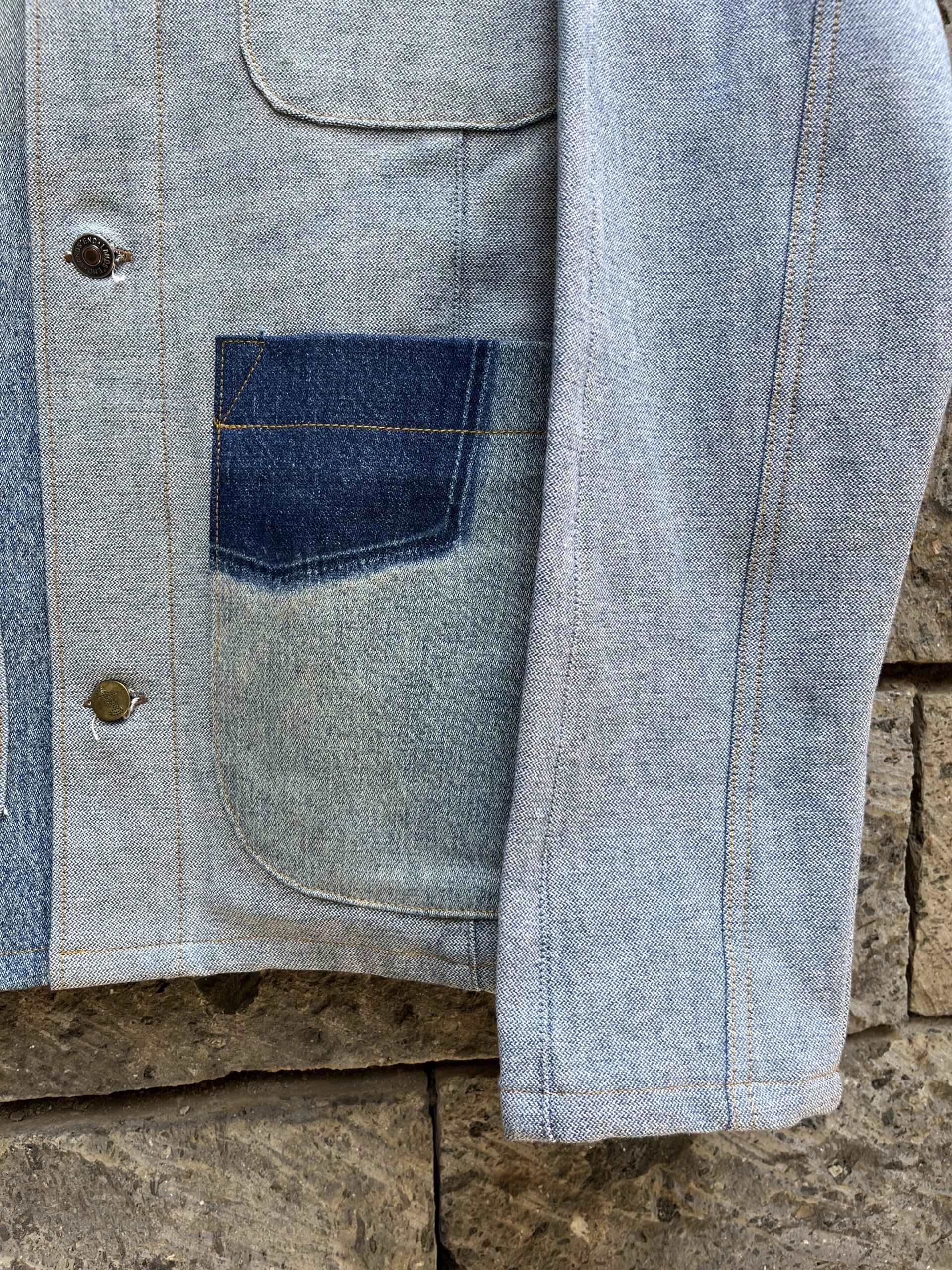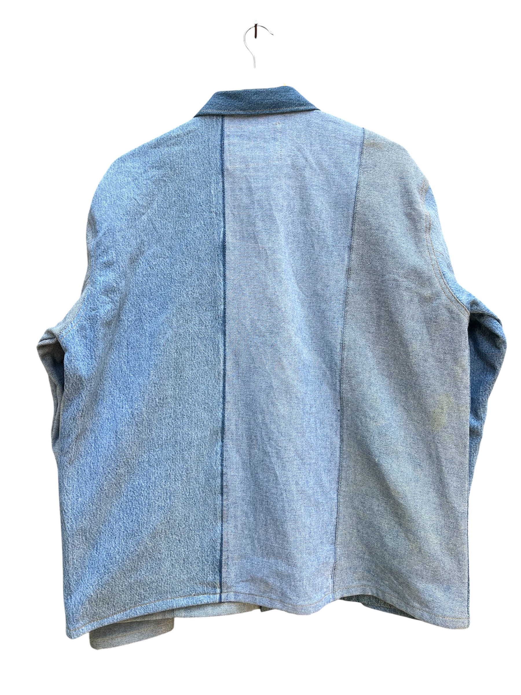 One of a kind,handmade denim chore jacket salvaged from discarded denim pants.