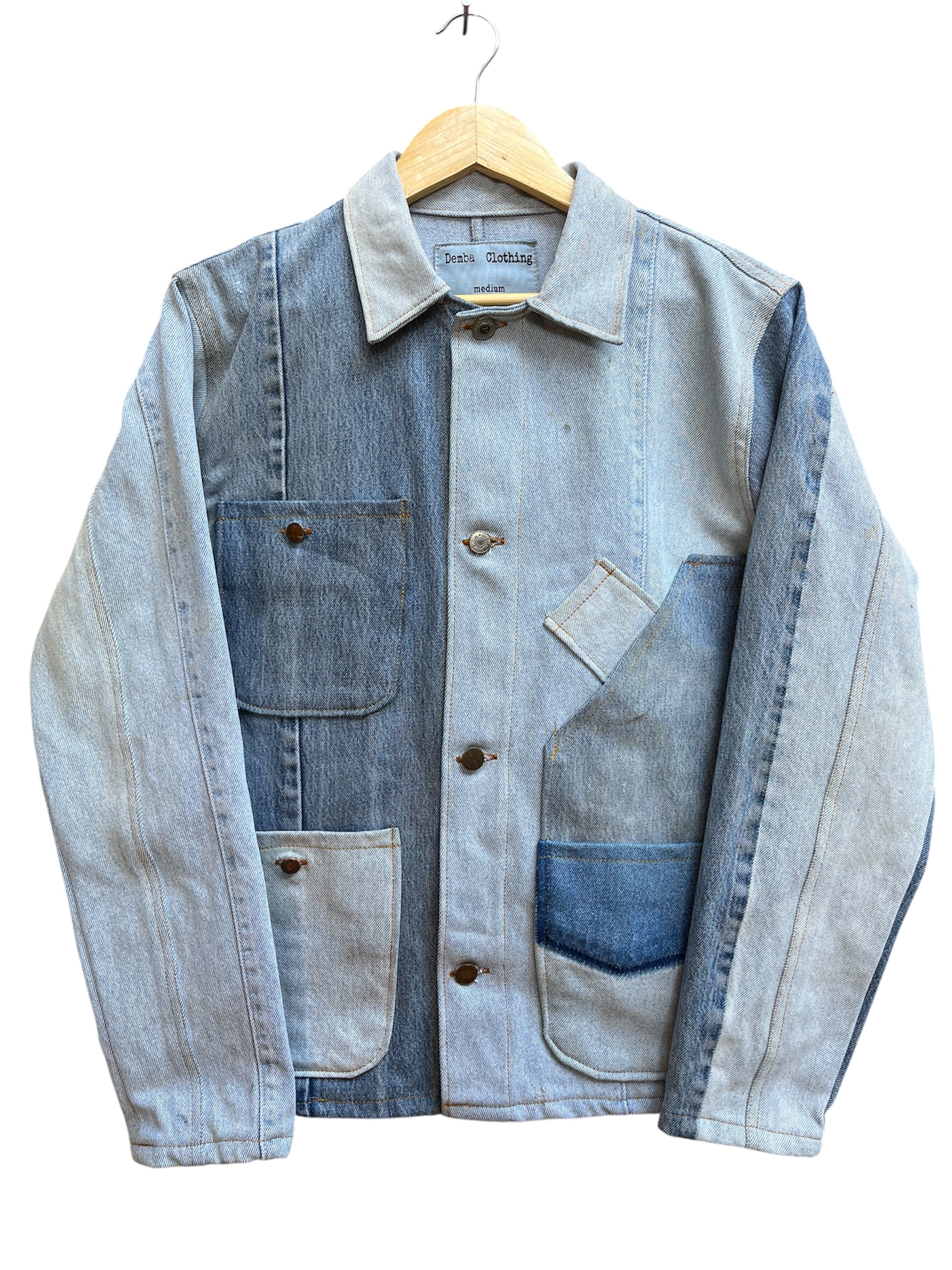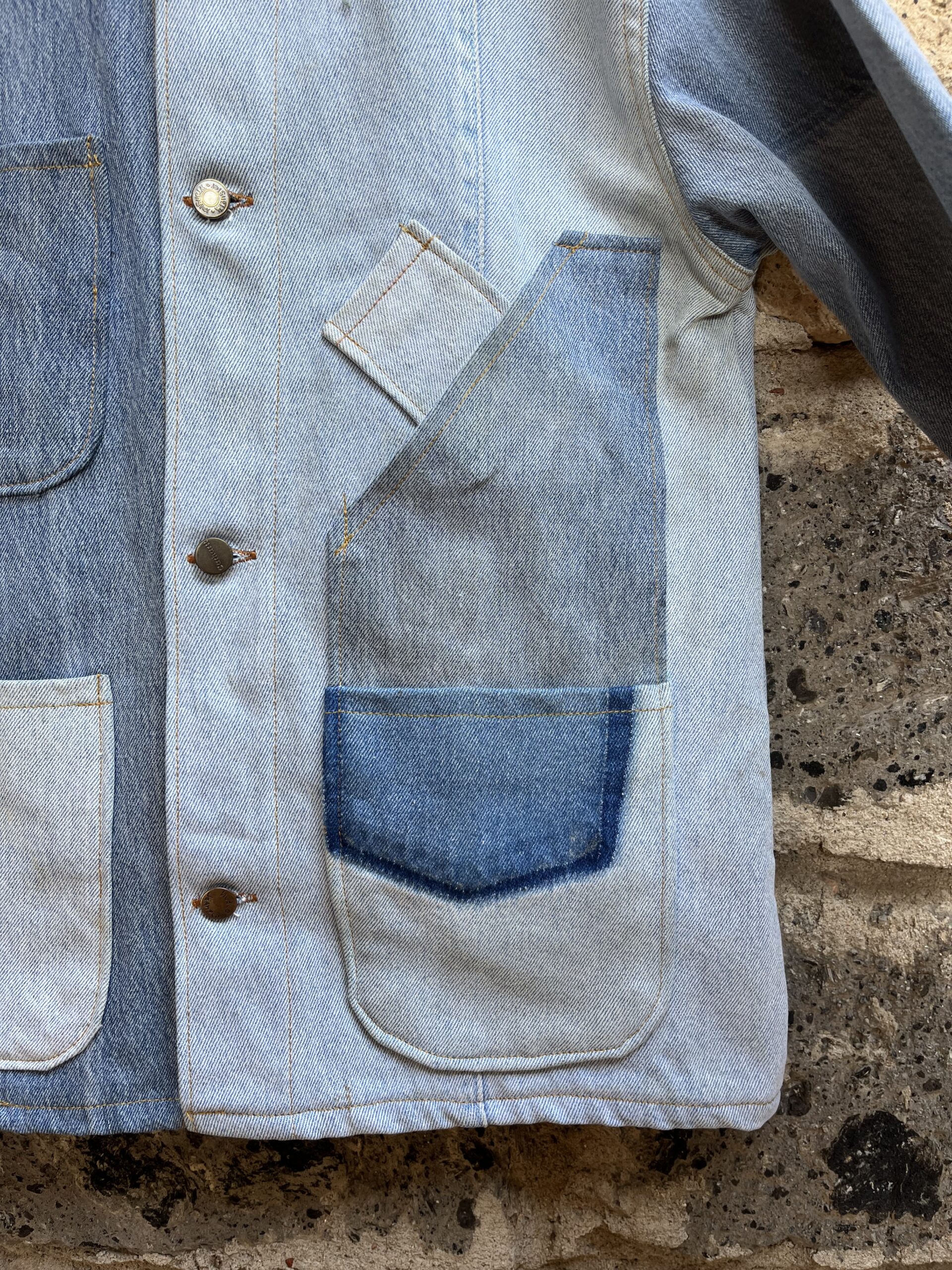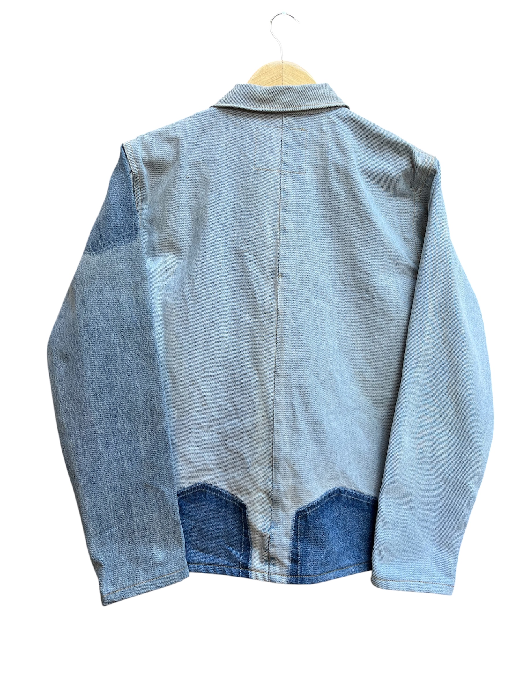 One of a kind,handmade chore jacket salvaged from vintage fabric/denim pants.